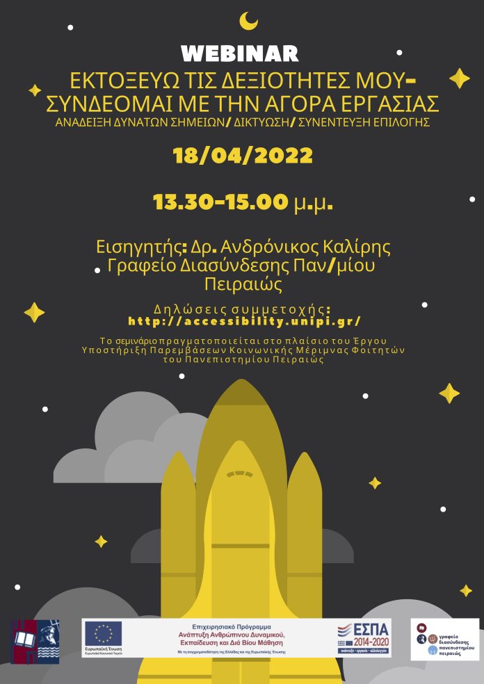 Το εξ αποστάσεως διαδικτυακό σεμινάριο (webinar) με τίτλο «Εκτοξεύω τις δεξιότητές μου-Συνδέομαι με την αγορά εργασίας», διάρκειας 90’, θα πραγματοποιηθεί τη Μ. Δευτέρα 18/04/2022, 13.30-15.00 μ.μ. Το σεμινάριο στοχεύει στην εξοικείωση και ενδυνάμωση των επωφελουμένων φοιτητών/ -τριών σχετικά με μεθόδους και διαδικασίες αποτελεσματικής προώθησης των προσωπικών, εκπαιδευτικών και επαγγελματικών χαρακτηριστικών και των δεξιοτήτων τους (cv, συνοδευτική επιστολή, συνέντευξη επιλογής, προφίλ LinkedIn) στην αγορά εργασίας αλλά και στις σπουδές (λ.χ. αναζήτηση μεταπτυχιακού). Οι ενδιαφερόμενοι/ -ες φοιτητές/ -τριες μπορούν να δηλώσουν συμμετοχή στην ιστοσελίδα accessibility.unipi.gr. Μετά τη δήλωση συμμετοχής θα λάβουν αυτόματα έναν ηλεκτρονικό σύνδεσμο (link) στην ηλεκτρονική τους διεύθυνση (email). Πατώντας στο link θα μπορούν να συμμετάσχουν στο διαδικτυακό σεμινάριο κατά την προγραμματισμένη ώρα διεξαγωγής. Σημειώνεται ότι για να αποφευχθούν τεχνικά προβλήματα σύνδεσης, καλό θα είναι οι συμμετέχοντες/ -ουσες να παρακολουθήσουν το σεμινάριο με τη χρήση laptop ή σταθερού Η/Υ (desktop).