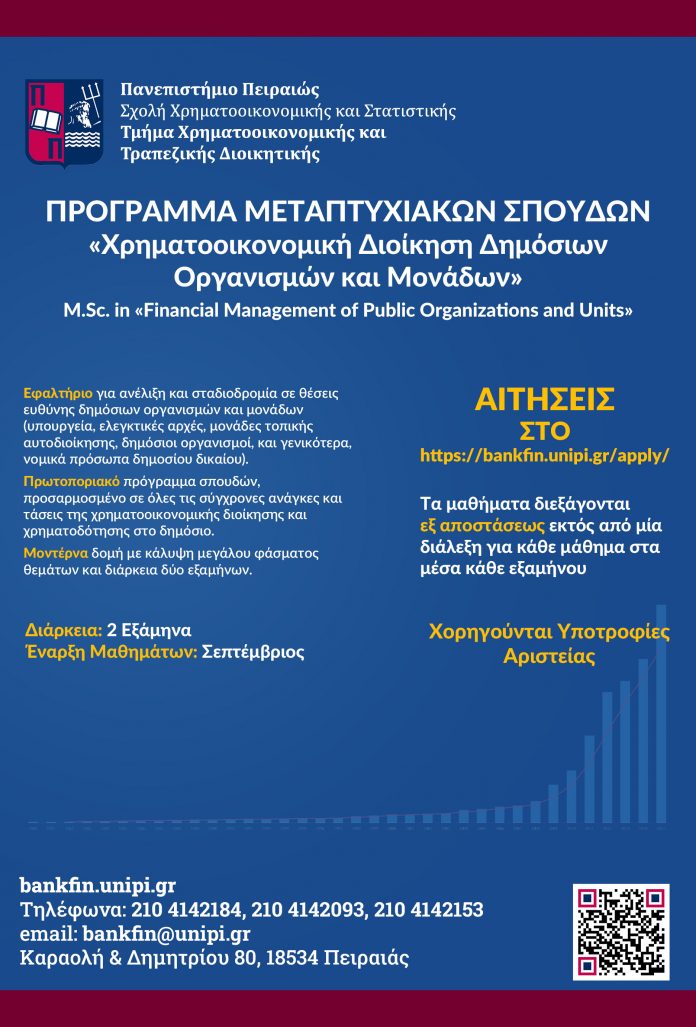 NewsΜΕΤΑΠΤΥΧΙΑΚΑ & ΥΠΟΤΡΟΦΙΕΣ Master of Science in «Financial Management of Public Organizations and Units» Από cmak - Παρασκευή, 21 Ιουλίου , 2023 935 ΑΙΤΗΣΗ