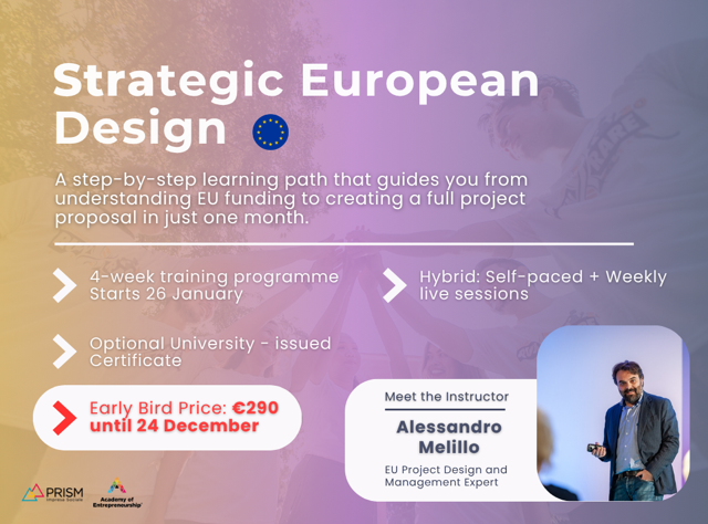 The Academy of Entrepreneurship (AKEP) releases a new training programme in collaboration with PRISM Impresa Sociale, Strategic European Design, 4-week training programme that offers a step-by-step introduction to EU project design — starting from the fundamentals of the EU funding system and leading you through the full creation of a project proposal. Ideal for anyone entering the EU project design field and seeking practical, applicable skills to prepare competitive project applications.