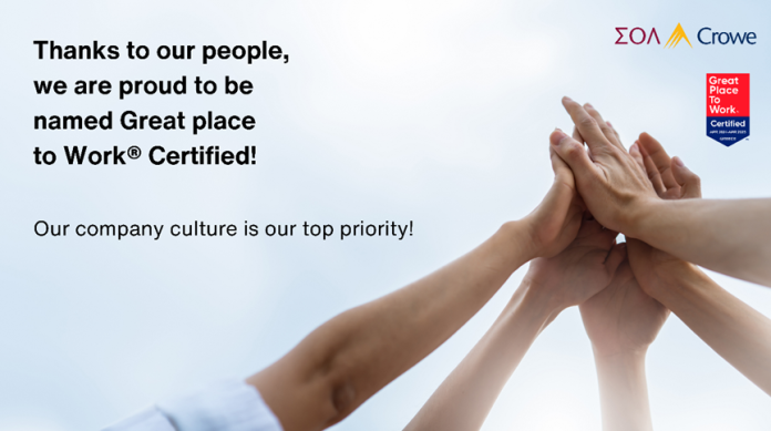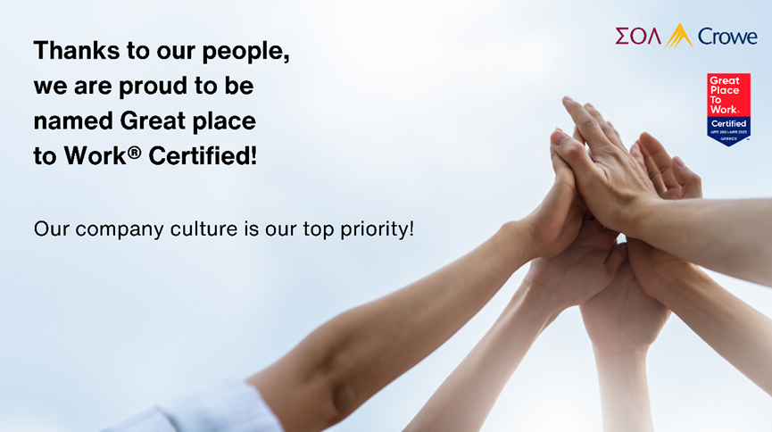 - Great Place to Work: Η ΣΟΛ Crowe, έχoντας πιστοποιηθεί από το Great Place To Work® Hellas για δεύτερη συνεχή χρονιά και έχοντας ενταχθεί στη λίστα Best Workplaces™ Professional Services & Consulting στην Ελλάδα για το έτος 2025, προσφέρει ένα εξαιρετικό, συμπεριληπτικό και υποστηρικτικό εργασιακό περιβάλλον, στο οποίο οι άνθρωποί της αισθάνονται σημαντικοί και ασφαλείς.