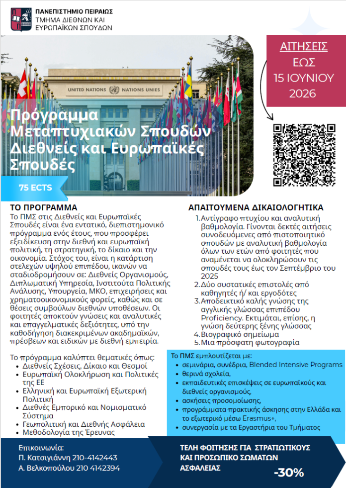 Το Τμήμα Διεθνών και Ευρωπαϊκών Σπουδών του Πανεπιστημίου Πειραιώς ανακοινώνει την προκήρυξη για το ακαδημαϊκό έτος 2026 – 2027 του Προγράμματος Μεταπτυχιακών Σπουδών: