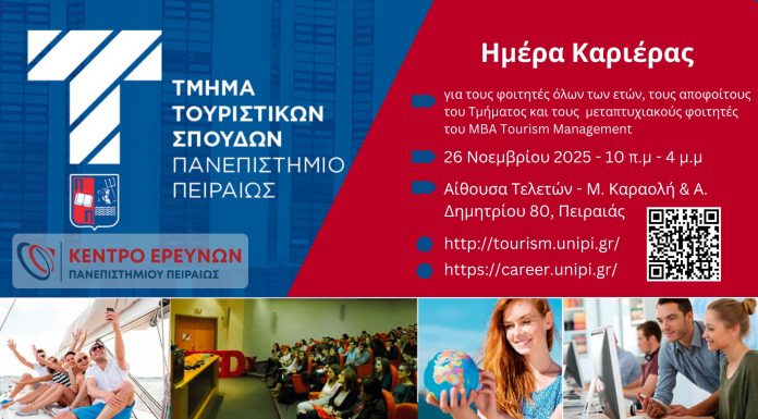 Το Τμήμα Τουριστικών Σπουδών διοργανώνει Ημέρα Καριέρας για τους φοιτητές και αποφοίτους του, την Τετάρτη 26 Νοεμβρίου 2025, από 10:00 έως 16:00, σε συνεργασία με το Γραφείο Διασύνδεσης του Πανεπιστημίου Πειραιώς.